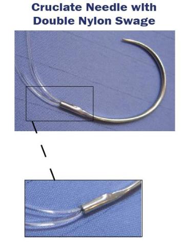 Double (looped) Monofilament Nylon with Swaged-on Cruciate Needle has a double nylon swage allowing the surgeon to pass around the lateral fabella only once to place 2 suture lines.