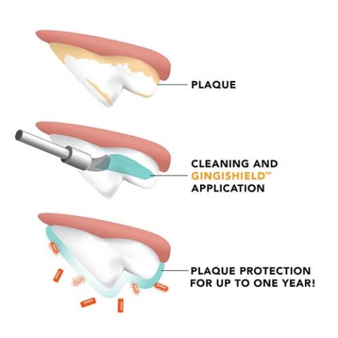 The benefit is that GingiShield significantly inhibits the attachment of bacteria to the tooth surface, which deters biofilm (plaque) formation. Biofilm is the main cause of gum disease (gingivitis and periodontitis). Properly applied, there is no known risk associated with GingiShield application other than the added anesthesia time, typically 10 minutes per patient with an experienced technician. GingiShield is based on the FDA-cleared DenteShield™ product used in human dentistry.