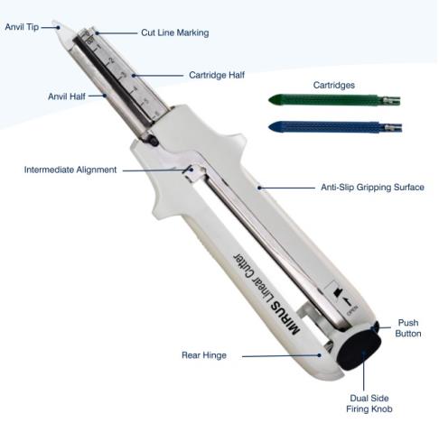 MIRUSTM Linear Cutter and Reloads are applicable in cutting, transecting and stapling of the alimentary canal, lings and bronchus tissues and organs. It offers two double staggered rows of titanium staples and simultaneously cuts and staples the tissue. MIRUSTM Linear Cutter & Reloads are available in 60mm, 80mm & 100mm length with two different sizes to accommodate various tissue thickness.
