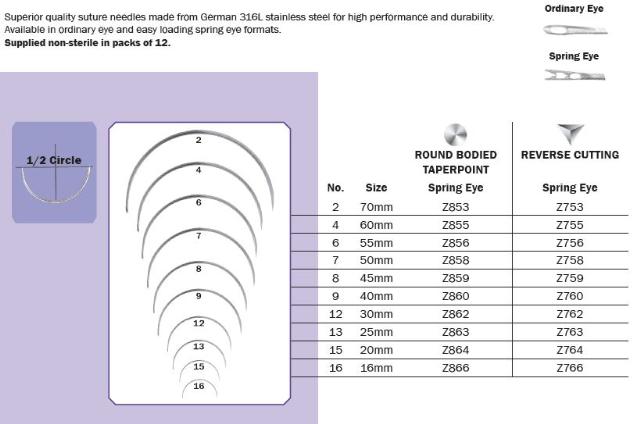 If you have never seen or used the spring eye format, you should check these out. Once threaded they allow for a flatter profile of the suture in the eye of the needle resulting in less suture bulk and drag as you pull through the tissue. This means easier passage and less trauma to the tissue.