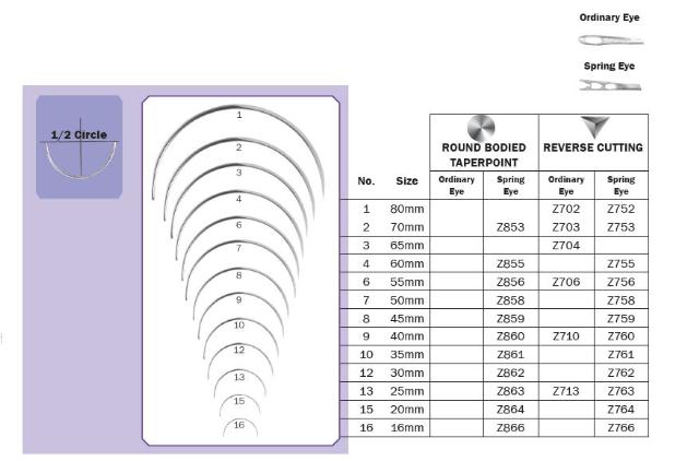 If you have never seen or used the spring eye format, you should check these out. Once threaded they allow for a flatter profile of the suture in the eye of the needle resulting in less suture bulk and drag as you pull through the tissue. This means easier passage and less trauma to the tissue.